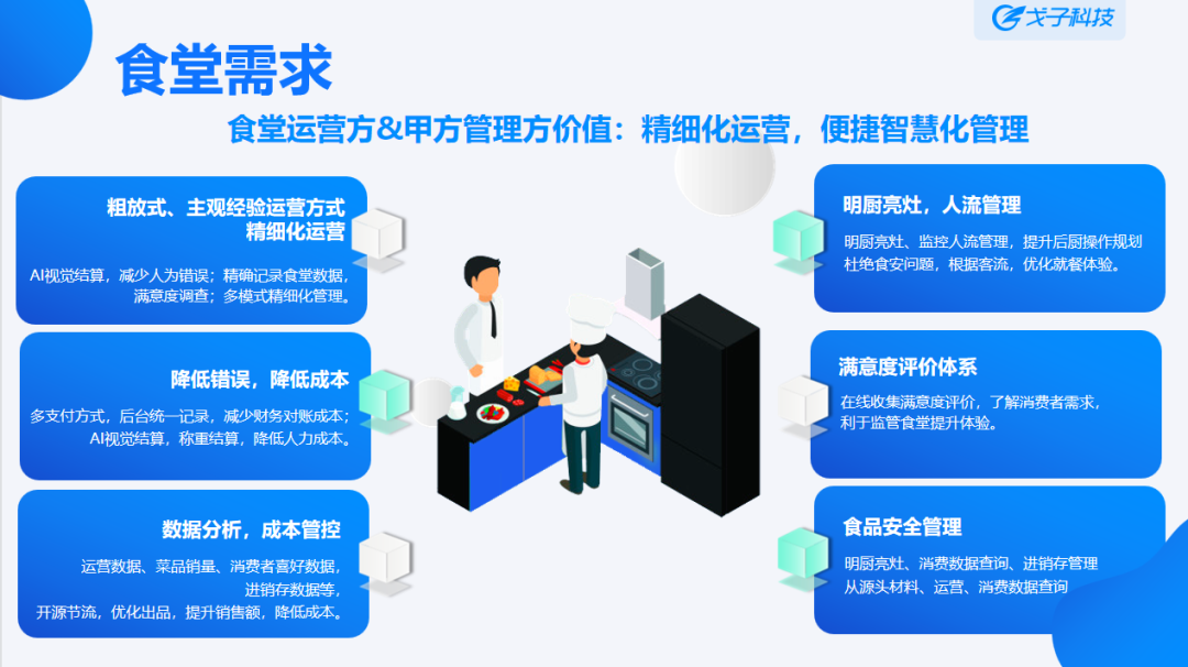 戈子科技是一家集研發、銷售、生產和服務于一體的高新技術企業,致力于為團餐行業提供科學、高效的智慧食堂全場景解決方案!