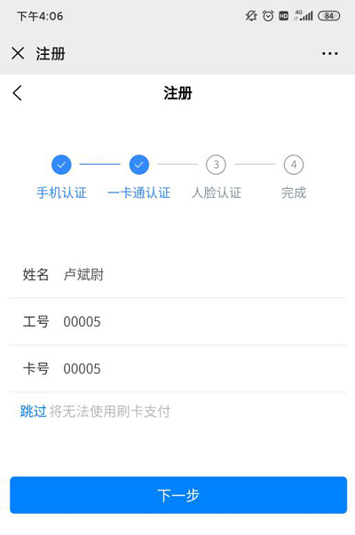 ①輸入姓名、工號、卡號,點擊“下一步按鈕”,進入人臉綁定頁面