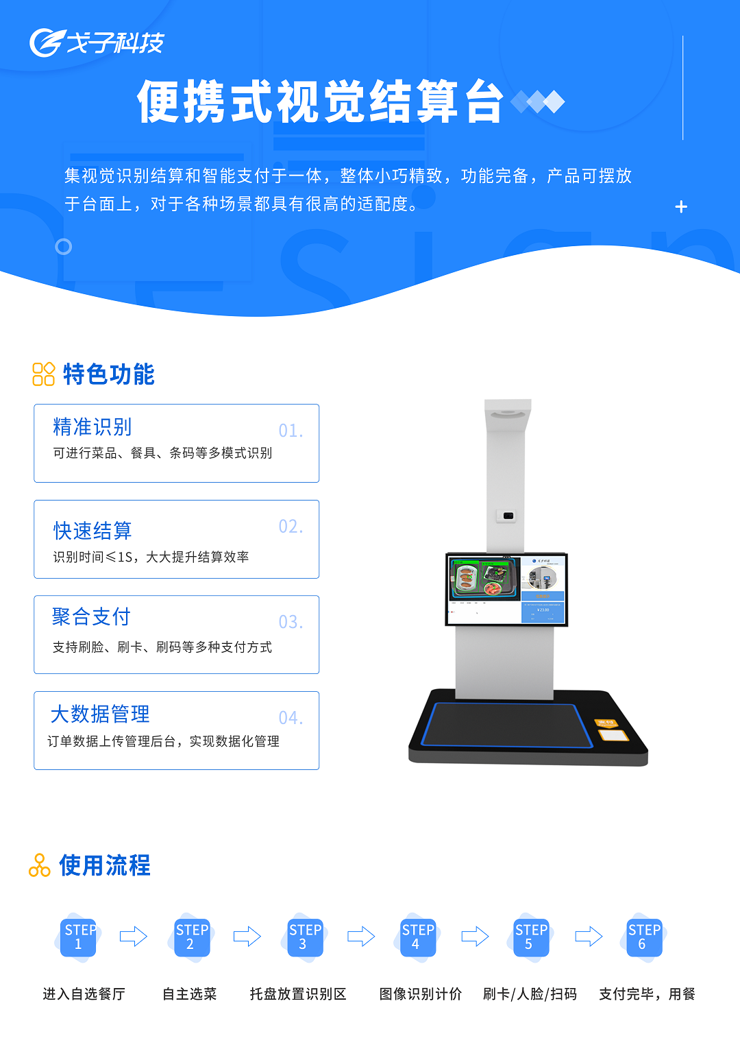 戈子科技單通道視覺結算臺集視覺識別結算和智能支付于一體,單臺設備能實現一條隊伍結算,智能識別結算,讓結算效率加倍提升。