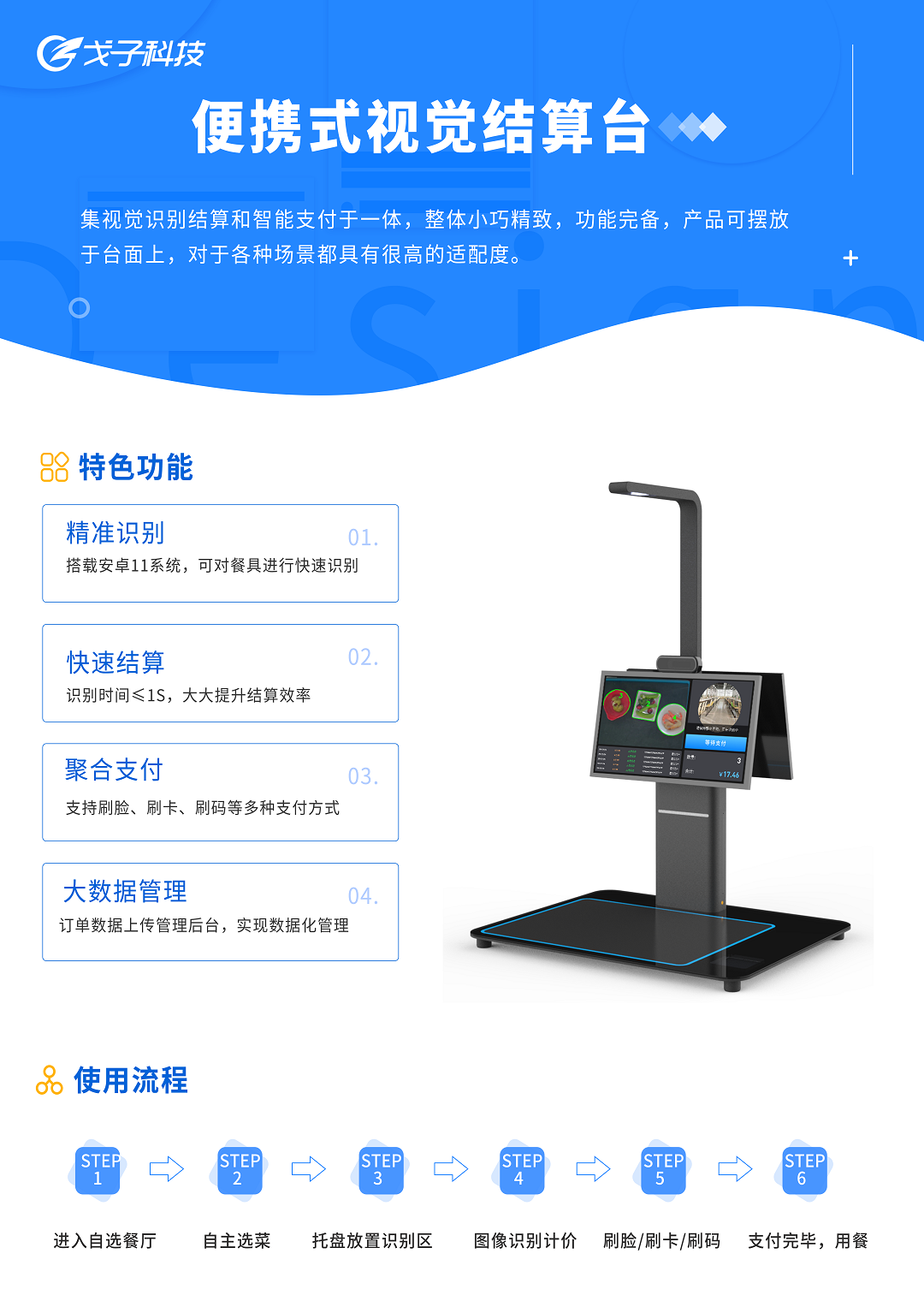 戈子科技視覺結(jié)算臺(tái),是一款依托圖像識(shí)別技術(shù)用于團(tuán)膳領(lǐng)域?qū)崿F(xiàn)智能結(jié)算的創(chuàng)新型設(shè)備,能夠根據(jù)餐具的大小、形狀、顏色快速智能識(shí)別 “結(jié)算區(qū)”中的餐具、產(chǎn)品圖像并智能精準(zhǔn)結(jié)算,并連接一卡通等第三方支付系統(tǒng),讓就餐者快速完成支付,減少排隊(duì)時(shí)間。